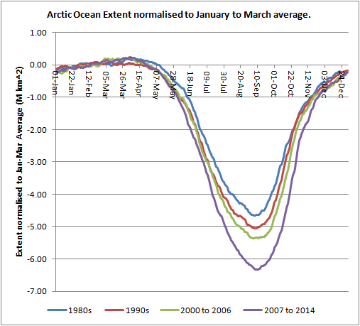 Taking Arctic Ocean extent, I have used the January to March average as a baseline to bring the different periods up to similar levels and leave the summer decline to do what it will so to speak.